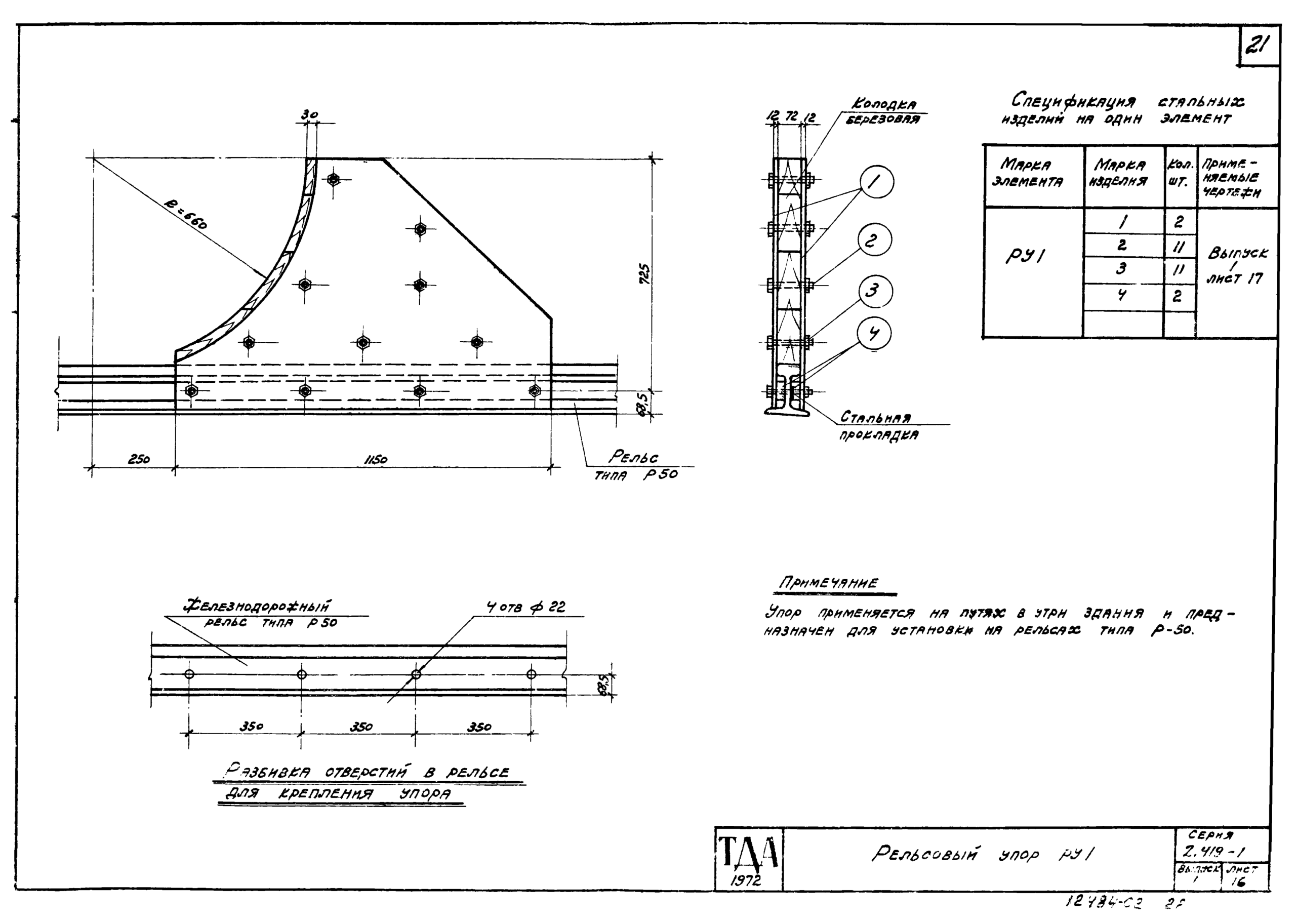 Данная конструкция гасит остаточную скорость крана и не дает ему сойти с концевых участков пути. Упор тупиковый ударного типа представляет собой сборно-сварную конструкцию, состоящую из отдельных деталей (швеллера, листы). Для снижения силы удара предусмотрен амортизатор, который выполняется из древесины или резины. Установка и закрепление упора на рельсе осуществляется с помощью болтовых соединений.